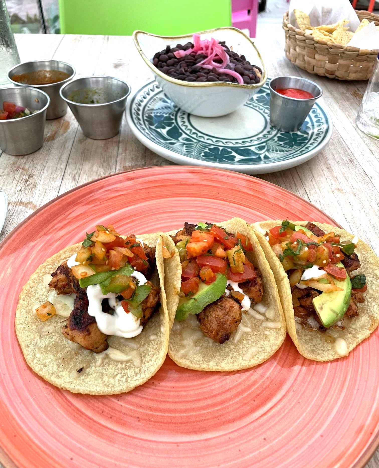 An order of chicken tacos arrives with three overstuffed tortillas filled with melted Chihuahua cheese topped with fresh avocado, salsa, and crema. The chicken Mission burrito served on their lunch menu is overstuffed with a delicious combination of white rice, black beans, queso, guacamole, pico de gallo, and crema.