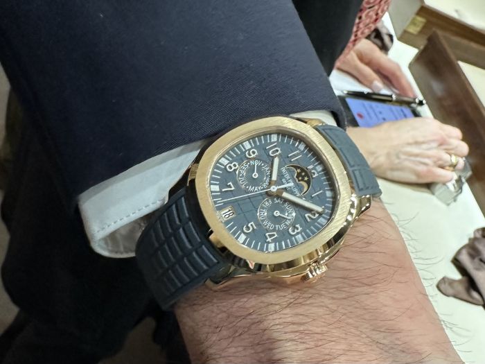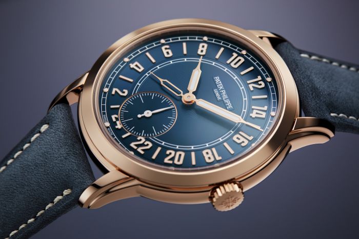 The watch’s 42mm rose-gold case nicely complements a sharp-looking blue dial that Patek Philippe has set with contemporary, high-relief rose gold numerals, hour markers, and five-minute cabochons.