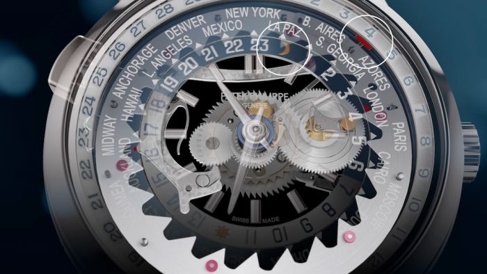In this illustration, note that the new Patek Philippe Caliber 240 HU C features a patented central differential system comprising two concentric star-type gear wheels to manage the local-time date. The local time is the time zone selected at 12 o’clock and indicated by the center hands.