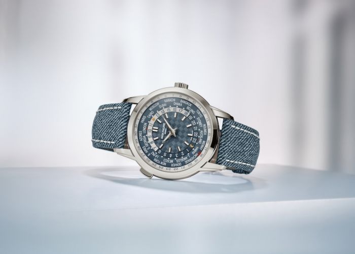 Patek Philippe displayed the new World Time Reference Ref. 5330G-001 has a new denim weave strap and a casual bracelet, which is also seen on other debuts. The price is $76,594.
