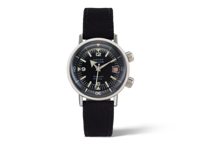 Wempe Vintage Sea-Cup, automatic, anti-magnetic, and shock-resistant stainless steel diving watch with a second crown to set diving time on a diving bezel inside of the case.
