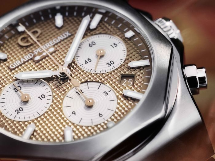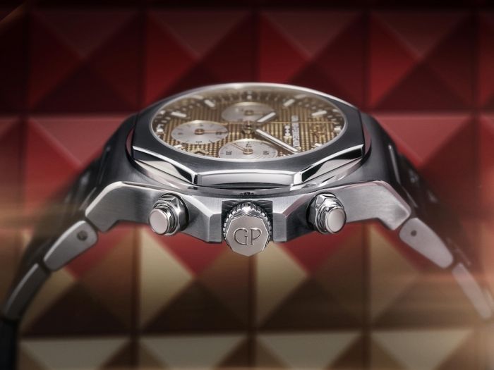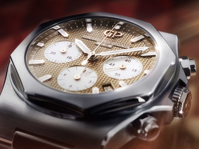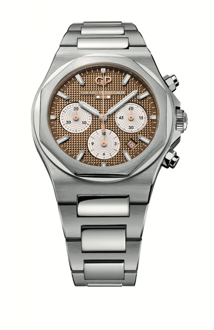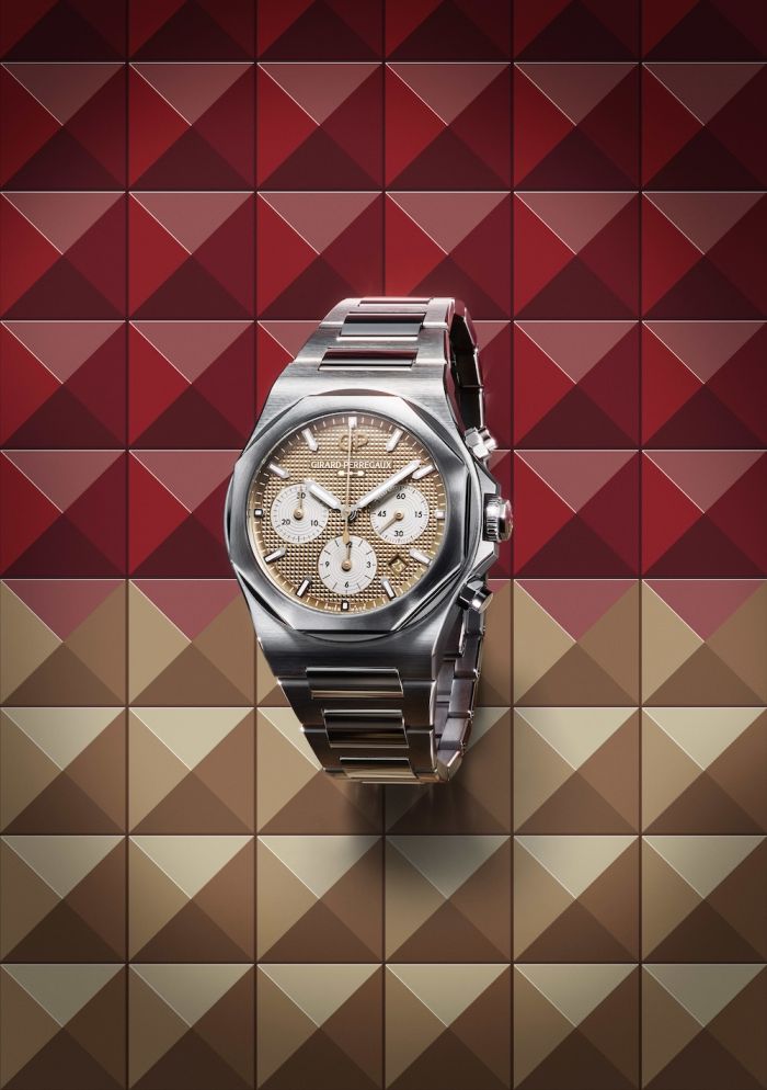 The new Wempe Signature Collection x Girard-Perregaux Laureato Chronograph is a 42mm by 12.1mm edition of the watchmaker’s well-known integrated steel-cased series. With Wempe, Girard-Perregaux has created a special copper-colored dial with a Clous-de-Paris pattern specially designed to reflect and refract light.