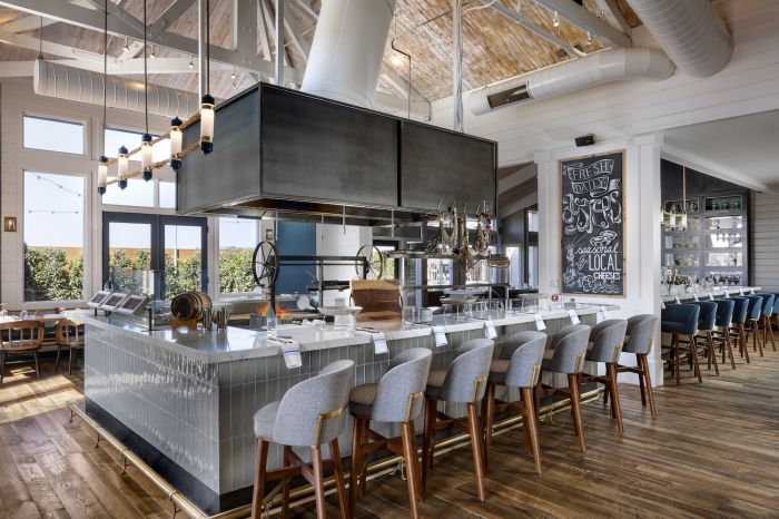 Resort guests, as well as locals, also love on-site restaurant Salt Wood Kitchen & Oysterette, overseen by Michelin Star experienced executive chef Jonathan Rodriguez. In the varied dining areas, a palette of greens, greys, and indigo blues are accented with oxidized metal, slate, and a reclaimed oak and polished concrete floor. Salt Wood is known for its locally sourced cuisine and creative cocktails; the convivial spot’s ever-changing menu focuses on raw, cured, and wood-fired dishes, with a focus on seafood. A live-fire grill serves as the heart of the space, and wood-fired oysters are the starring attraction. Enjoy them with toppings like kimchi butter, Bloody Mary tomato, celery mignonette, and fresh horseradish.