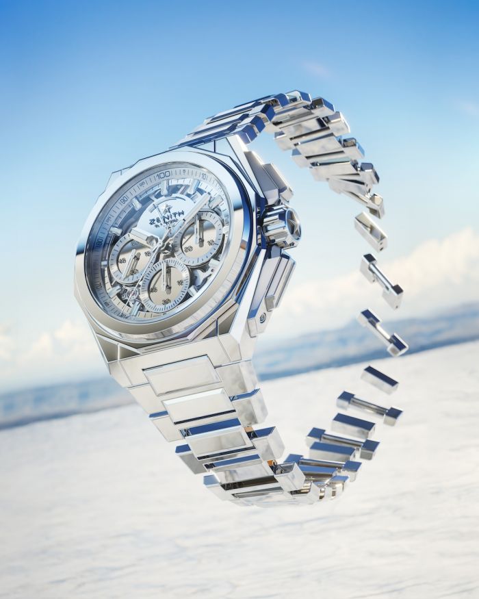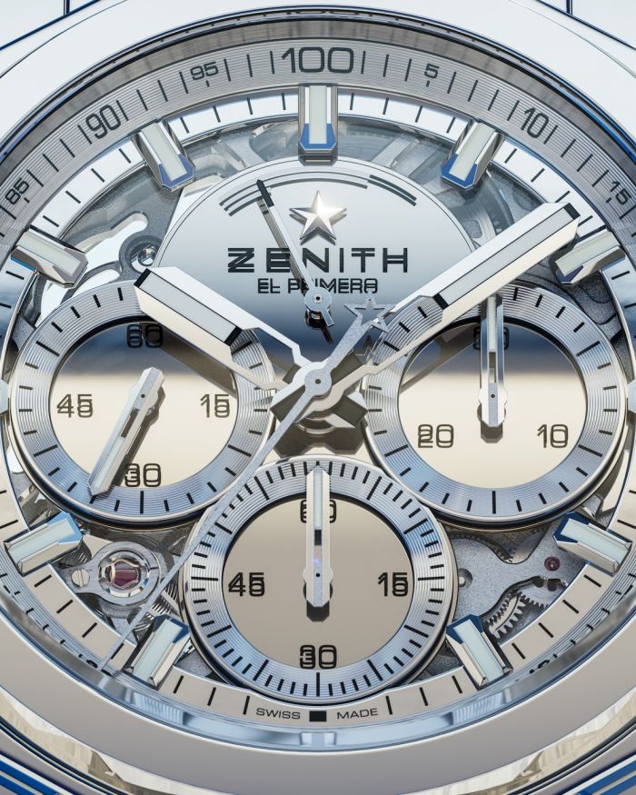 Without colors, the new watch seems to blend with its environment. Zenith pairs the mirror finish with an equally dramatic multi-layered open dial that features a sapphire center, finished to be both translucent and reflective.