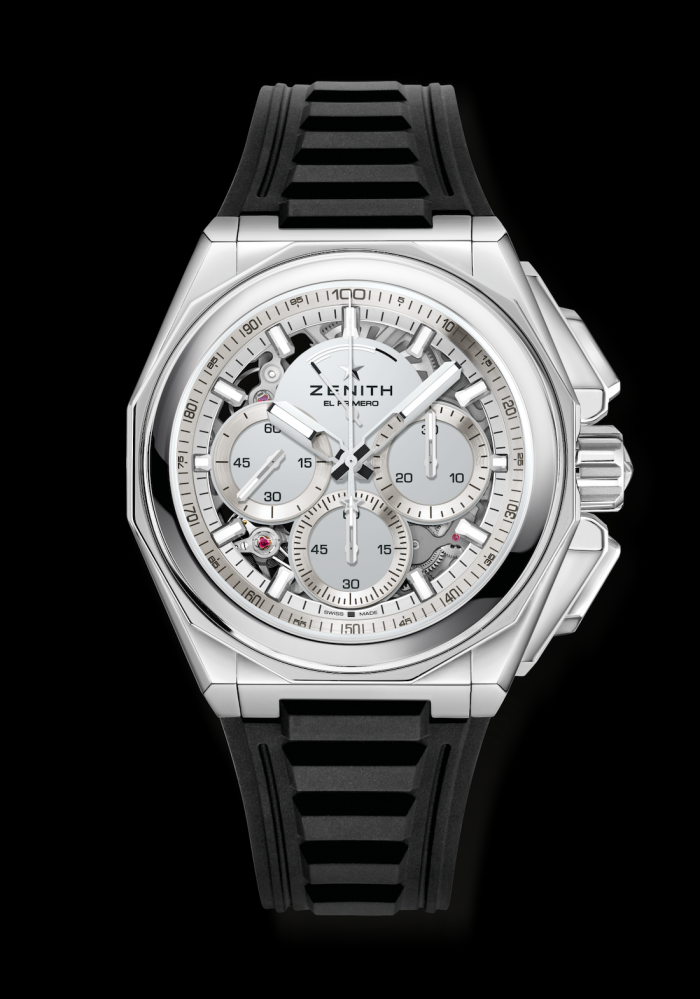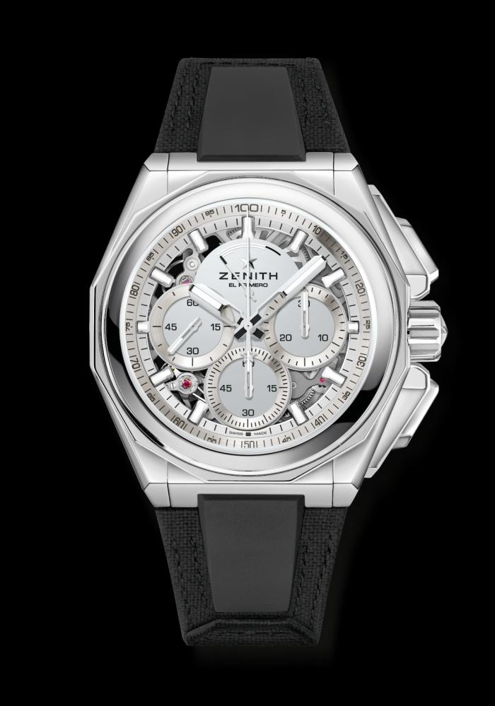 Zenith attaches the new watch to the wrist with a black Velcro strap and a rubber strap, which can be easily swapped with the steel bracelet using the quick strap-change mechanism on the back of the case.